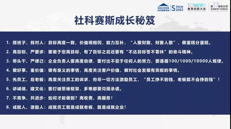各位親愛的教育界同仁們,大家下午好。非常高興能夠參加校長邦舉辦的TOWER大會,邀請我在會上分享企業(yè)的成長秘笈。其實(shí)企業(yè)的成長都是一步一步走下來的。