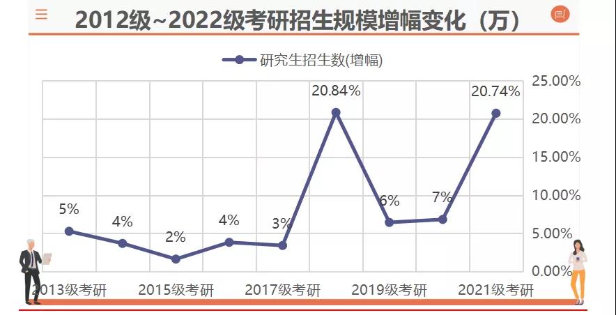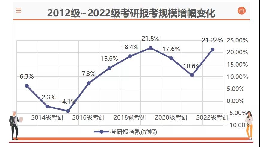 從數(shù)據(jù)及圖示可以看出,考研熱度持續(xù)升溫,考研人群增幅有逐年擴(kuò)大的趨勢(shì)。在多重外因推動(dòng)下,2022級(jí)碩士研究生報(bào)名人數(shù)增長(zhǎng)顯著,增幅達(dá)到21.22%,為近十年考研報(bào)名人數(shù)增幅第二最。