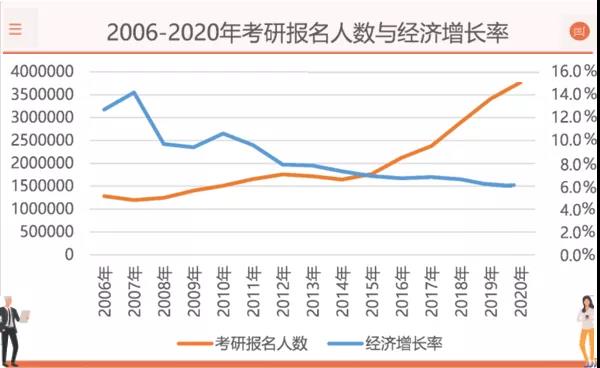 圖3:2006~2020年考研報(bào)名人數(shù)同經(jīng)濟(jì)增長(zhǎng)率(數(shù)據(jù)源自:國(guó)家統(tǒng)計(jì)局,教育部)