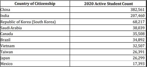 2021年3月份,美國(guó)移民和海關(guān)執(zhí)法局(ICE)發(fā)布了“2020年度國(guó)際學(xué)生和訪問(wèn)學(xué)者數(shù)據(jù)報(bào)告”。通過(guò)相關(guān)數(shù)據(jù)及對(duì)比,可以看出中國(guó)仍是美國(guó)最大留學(xué)生來(lái)源國(guó),約38.2萬(wàn)人,占國(guó)際學(xué)生總數(shù)的三分之一;其次是印度,約20.7萬(wàn)人;韓國(guó)居第三位,約6.8萬(wàn)人。