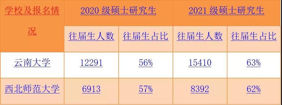 據(jù)研招網(wǎng)相關(guān)數(shù)據(jù)顯示,在全國(guó)碩士研究生統(tǒng)一招生考試中,2016—2019年應(yīng)屆生占比分別為56%/55%/52%/51%。雖然20-21級(jí)的應(yīng)往屆考生報(bào)名比例沒(méi)有公布,但是我們可以來(lái)看看部分學(xué)校公布的數(shù)據(jù):