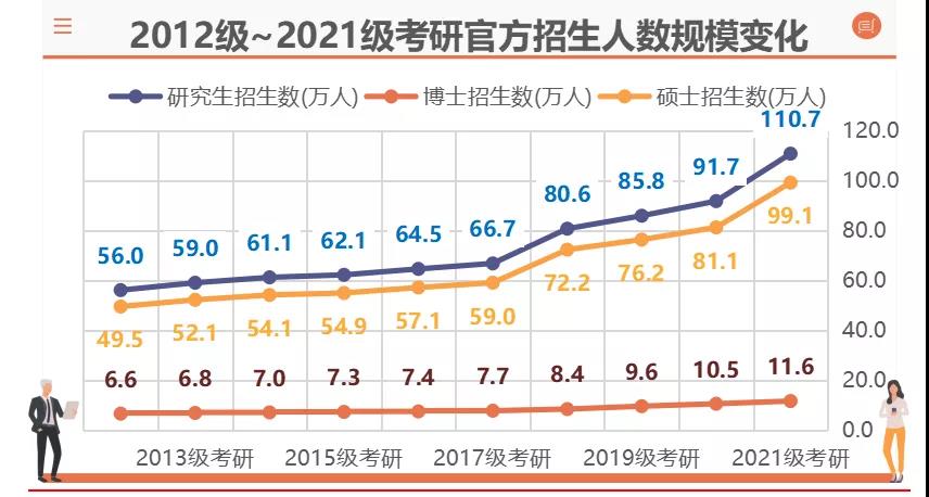 至此,經(jīng)過(guò)持續(xù)增長(zhǎng),我國(guó)研究生招生總量“里程碑式”地突破了100萬(wàn)人,達(dá)到110.66萬(wàn)人。博士研究生招生人數(shù)由2012級(jí)6.6萬(wàn)增長(zhǎng)到2021級(jí)的11.6萬(wàn),碩士研究生招生人數(shù)由2012級(jí)的49.5萬(wàn)增長(zhǎng)到2021級(jí)的99.1萬(wàn)。