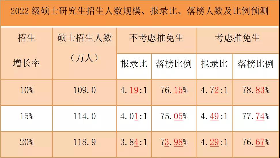 以2021級(jí)碩士研究生招生人數(shù)99.1萬(wàn)、2022級(jí)碩士研究生報(bào)考人數(shù)457萬(wàn)為基礎(chǔ)(假定推免人數(shù)跟去年持平,仍為12.26萬(wàn)人),則筆者提供如下預(yù)測(cè):