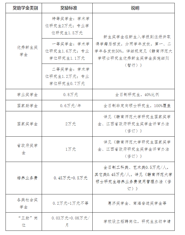 注:優(yōu)秀新生獎(jiǎng)學(xué)金獎(jiǎng)勵(lì)辦法及標(biāo)準(zhǔn)按《贛南師范大學(xué)碩士研究生優(yōu)秀新生獎(jiǎng)學(xué)金實(shí)施細(xì)則(暫行)》執(zhí)行。其他獎(jiǎng)項(xiàng)具體評(píng)選對(duì)象、評(píng)選條件等根據(jù)錄取當(dāng)年上級(jí)部門和學(xué)校有關(guān)政策規(guī)定執(zhí)行。