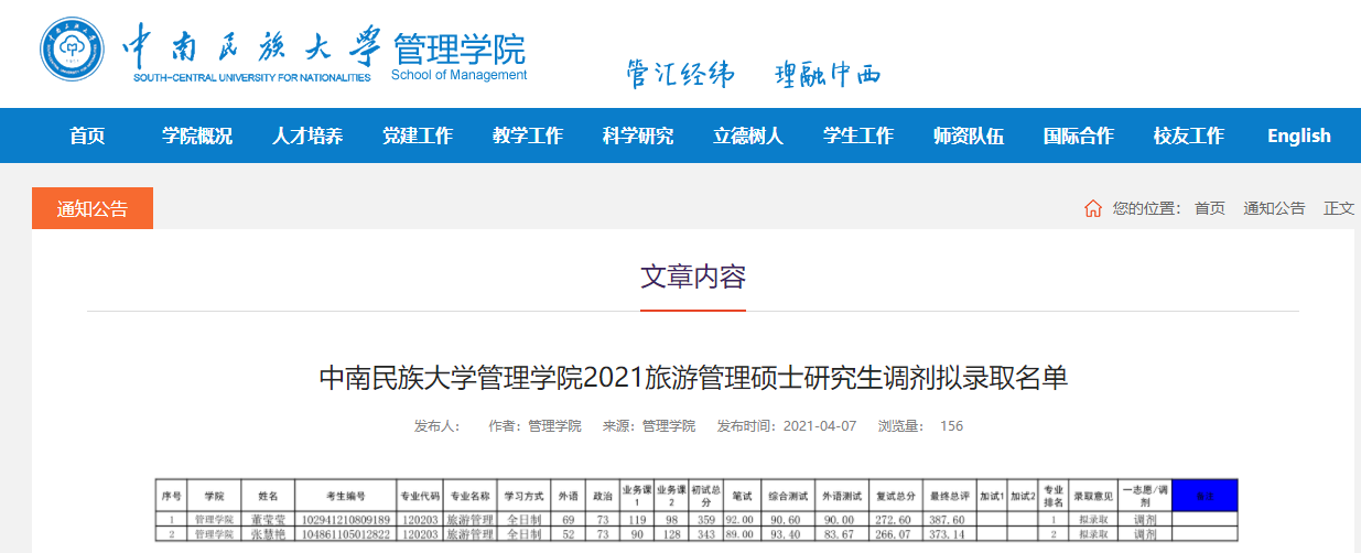 原文標(biāo)題:中南民族大學(xué)管理學(xué)院2021旅游管理碩士研究生調(diào)劑擬錄取名單