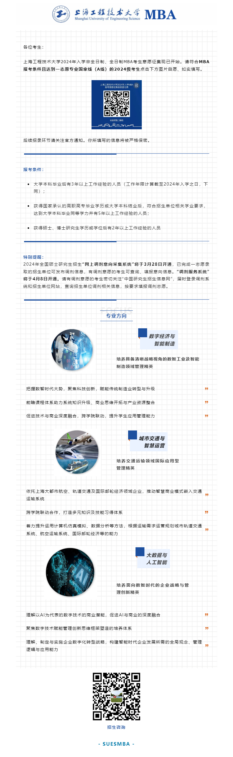 2024考研調(diào)劑:上海工程技術(shù)大學(xué)2024年入學(xué)MBA考生意愿征集