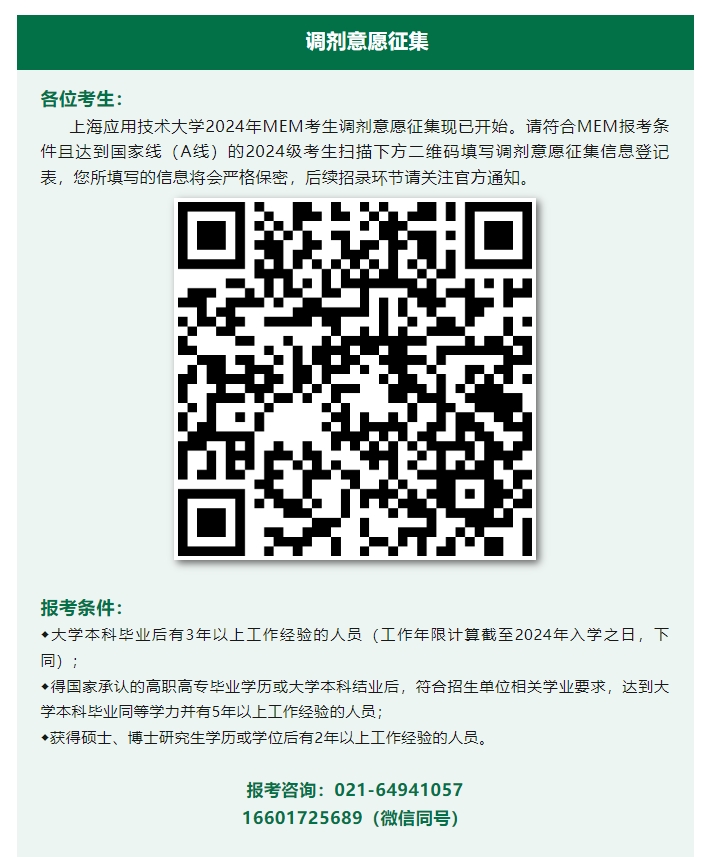 以上就是小編整理“2024考研調劑:2024上海應用技術大學MEM調劑意愿征集已開啟!”的全部內容,想了解更多調劑信息,請持續(xù)關注本網(wǎng)站。
