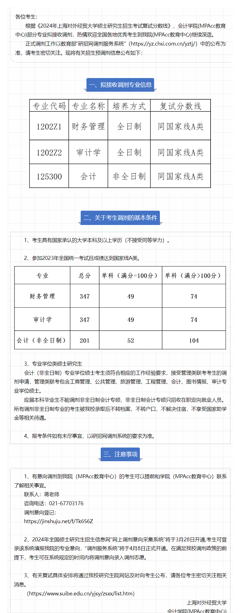 以上就是小編整理“2024考研調(diào)劑:2024年上海對外經(jīng)貿(mào)大學會計學院(MPAcc教育中心)碩士研究生預調(diào)劑公告”的全部內(nèi)容,想了解更多調(diào)劑信息,請持續(xù)關注本網(wǎng)站。