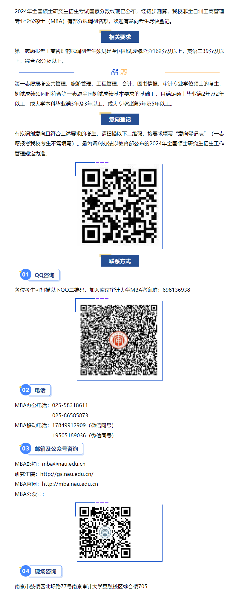 以上就是小編整理“2024考研調(diào)劑:南京審計大學(xué)2024年非全日制MBA意向登記中”的全部內(nèi)容,想了解更多調(diào)劑信息,請持續(xù)關(guān)注本網(wǎng)站。