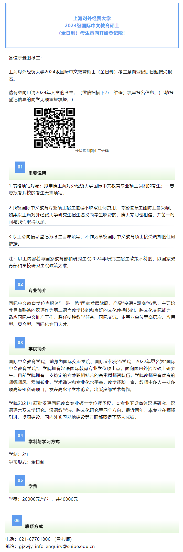 2024考研調(diào)劑:上海對外經(jīng)貿(mào)大學(xué)2024級國際中文教育碩士 (全日制)考生意向開始登記啦!