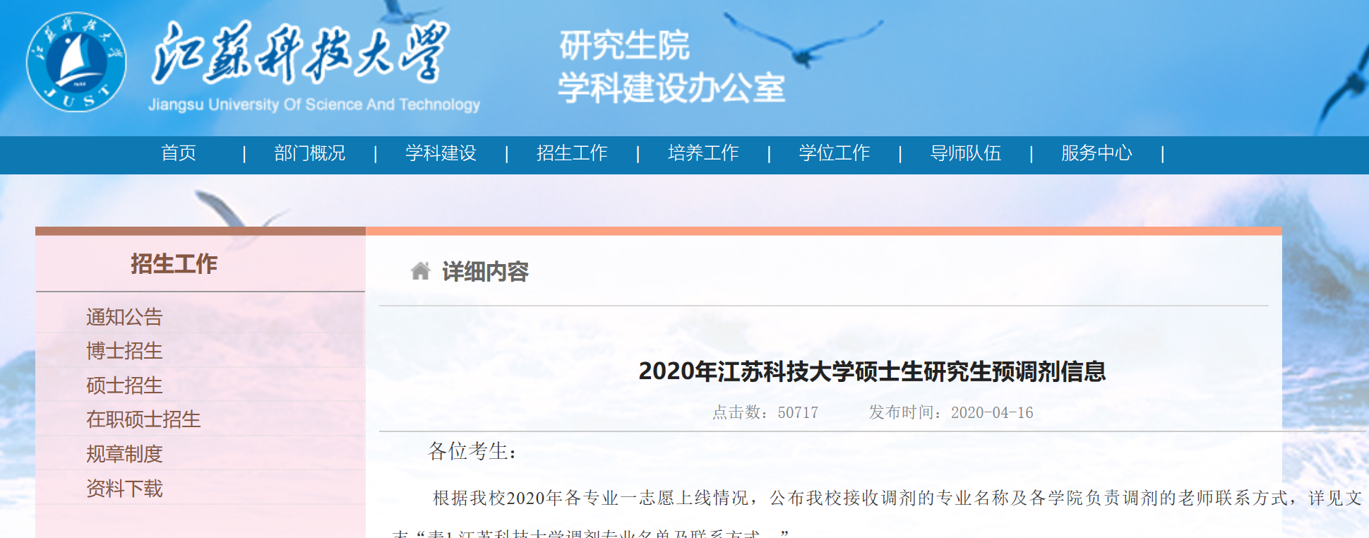 根據(jù)我校2020年各專業(yè)一志愿上線情況,公布我校接收調(diào)劑的專業(yè)名稱及各學院負責調(diào)劑的老師聯(lián)系方式,詳見文末“表1 江蘇科技大學調(diào)劑專業(yè)名單及聯(lián)系方式。”