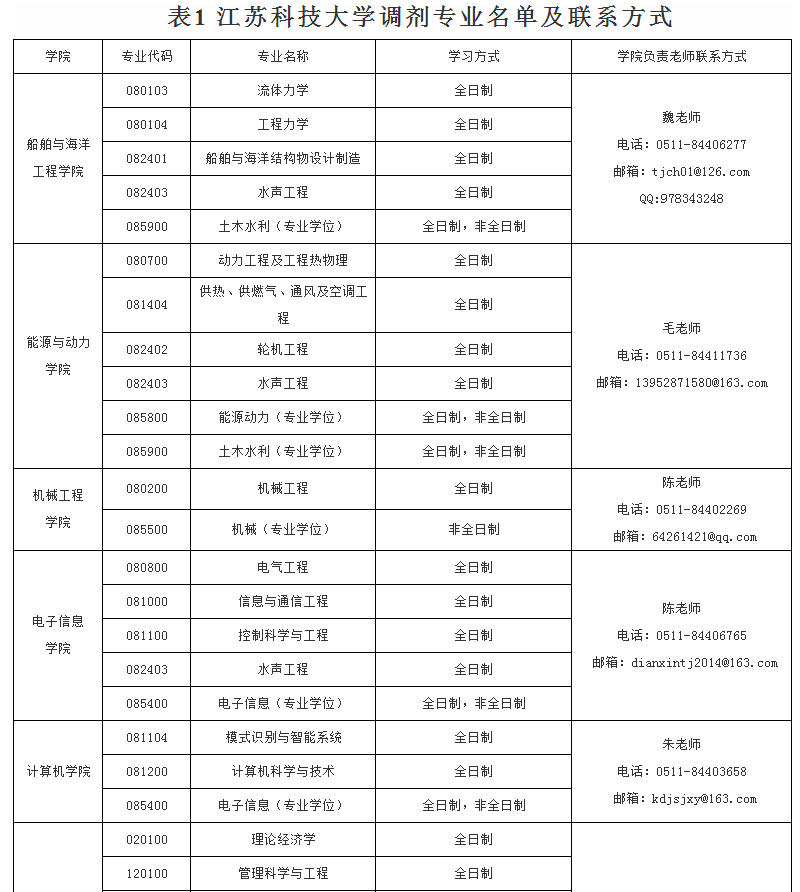 根據(jù)我校2020年各專業(yè)一志愿上線情況,公布我校接收調(diào)劑的專業(yè)名稱及各學院負責調(diào)劑的老師聯(lián)系方式,詳見文末“表1 江蘇科技大學調(diào)劑專業(yè)名單及聯(lián)系方式。”
