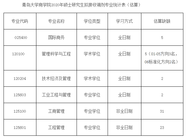 青島大學商學院2020年碩士研究生擬接收調劑專業(yè)統(tǒng)計表(估算)
