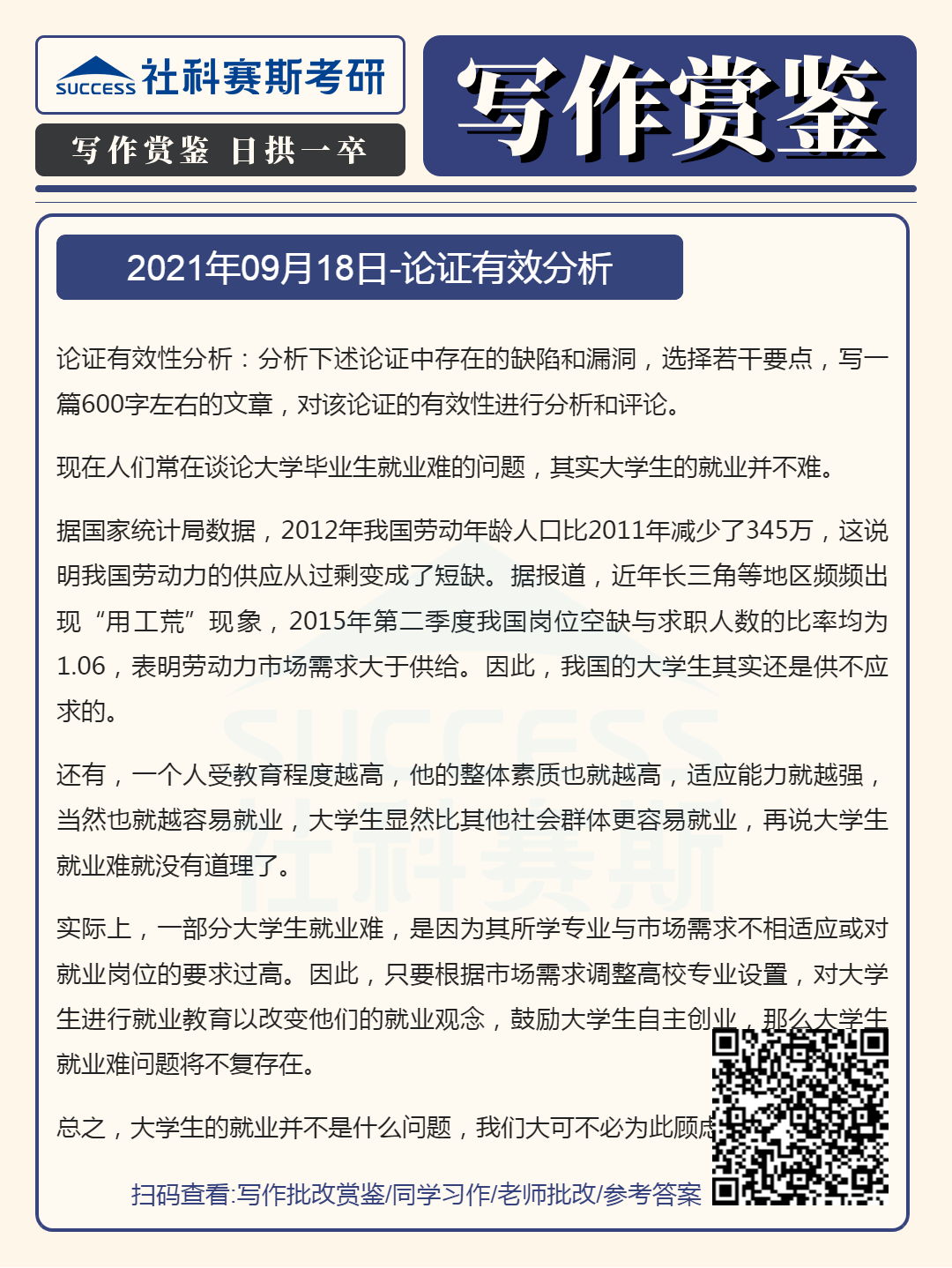 以上就是小編為大家整理“管理類(lèi)聯(lián)考寫(xiě)作備考:9月18日寫(xiě)作鑒賞及答案”的全部?jī)?nèi)容,希望各位考生堅(jiān)持利用起來(lái),想要獲取更多內(nèi)容請(qǐng)持續(xù)關(guān)注社科塞斯考研網(wǎng)。