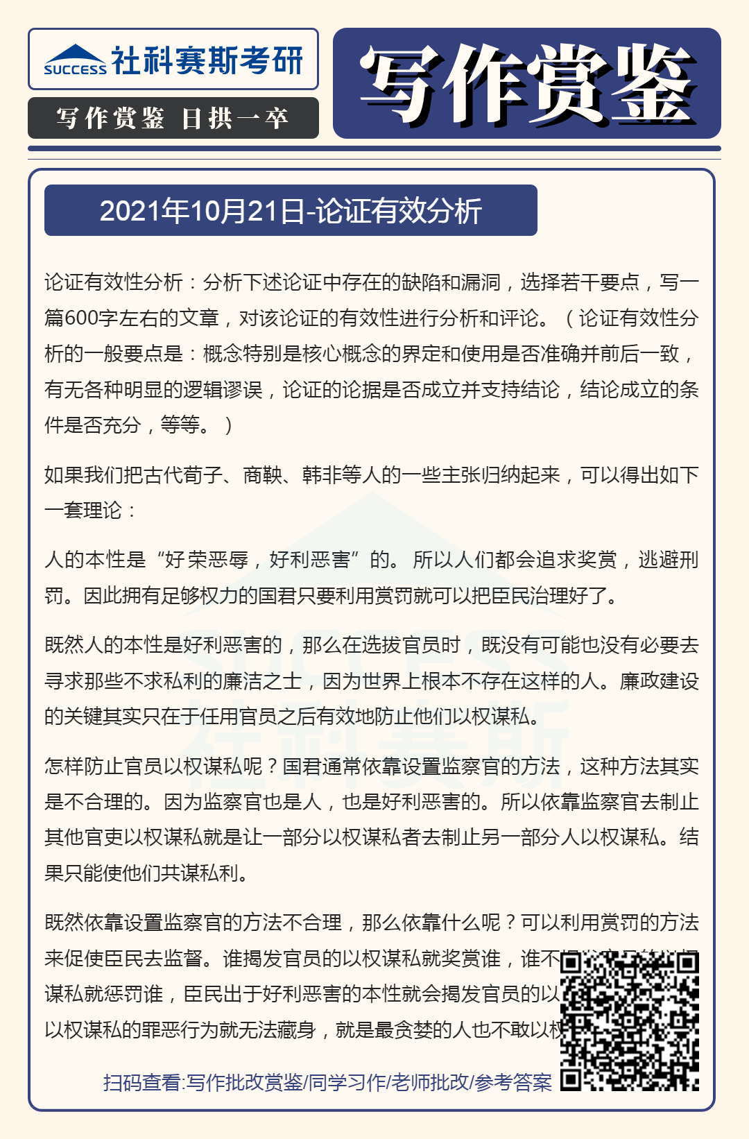 以上就是小編為大家整理“管理類聯(lián)考寫作備考:10月21日寫作鑒賞及答案”的全部內(nèi)容,希望各位考生堅持利用起來,想要獲取更多內(nèi)容請持續(xù)關(guān)注社科塞斯考研網(wǎng)。