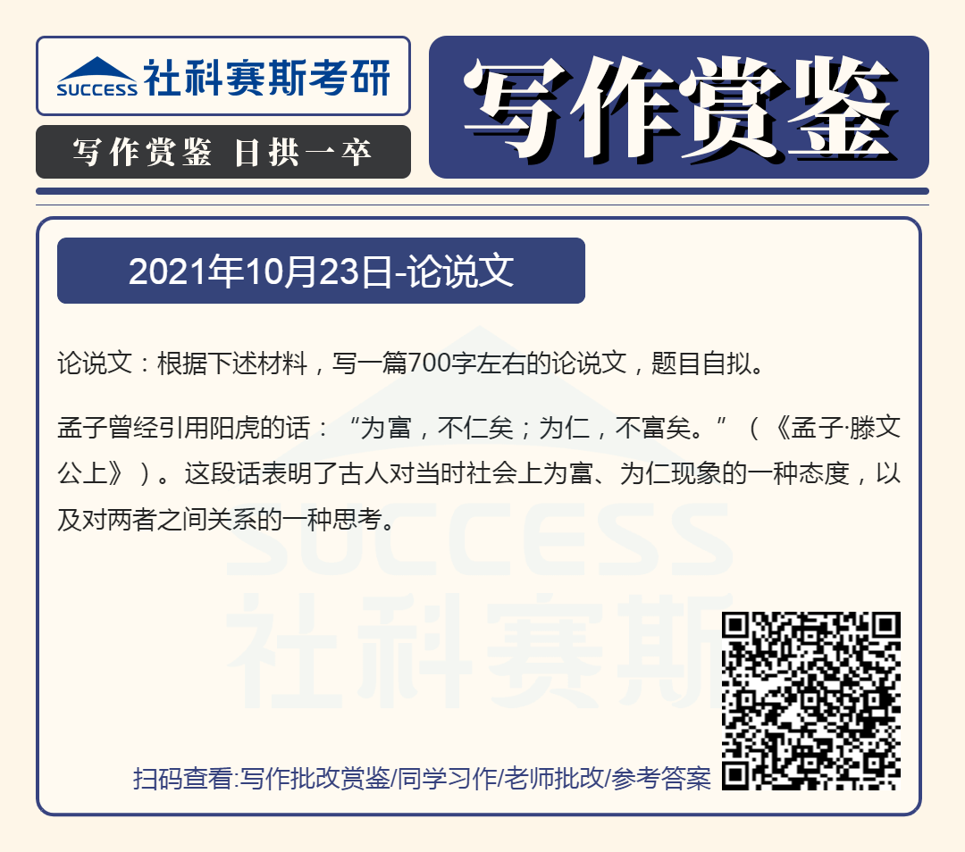 以上就是小編為大家整理“管理類聯(lián)考寫作備考:10月23日寫作鑒賞及答案”的全部內(nèi)容,希望各位考生堅(jiān)持利用起來,想要獲取更多內(nèi)容請持續(xù)關(guān)注社科塞斯考研網(wǎng)。