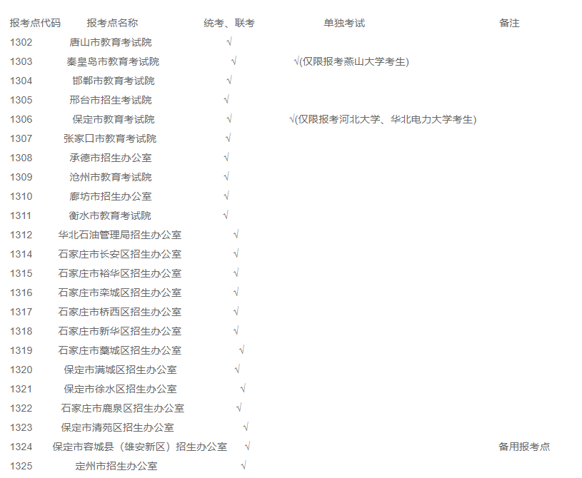 河北省2020年全國碩士研究生招生考試報考點設置及接收考試方式類型一覽表(附表)