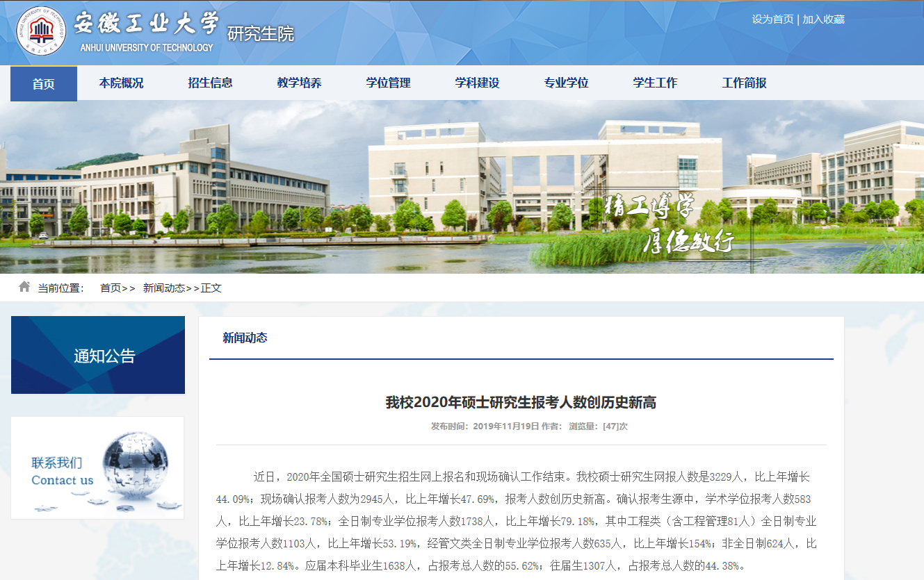 2020考研現(xiàn)場(chǎng)確認(rèn)已經(jīng)結(jié)束!網(wǎng)上有人預(yù)測(cè)說(shuō)2020考研報(bào)考人數(shù)將超過(guò)350萬(wàn),目前官方總統(tǒng)計(jì)數(shù)據(jù)還未出來(lái),但已有部分院校和省市公布了2020考研報(bào)考人數(shù)。今天,小編給大家?guī)?lái)“安徽工業(yè)大學(xué)2020碩士研究生報(bào)考人數(shù)比去年增長(zhǎng)了44.09% ”的相關(guān)新聞內(nèi)容,大家可以了解一下哦!