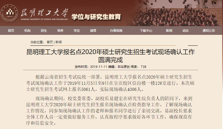 根據(jù)云南省招生考試院統(tǒng)一部署,昆明理工大學報名點2020年碩士研究生招生考試現(xiàn)場確認工作于2019年11月5日至9日在呈貢校區(qū)信自樓一樓126室進行。本次碩士研究生招生考試網(wǎng)上報名5061人,實際現(xiàn)場確認4306人。