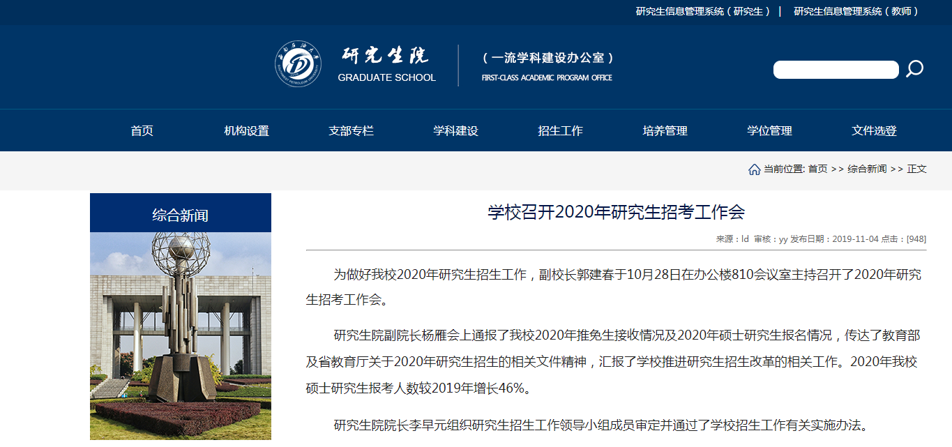 推免生接收情況及2020年碩士研究生報(bào)名情況,傳達(dá)了教育部及省教育廳關(guān)于2020年研究生招生的相關(guān)文件精神,匯報(bào)了學(xué)校推進(jìn)研究生招生改革的相關(guān)工作。