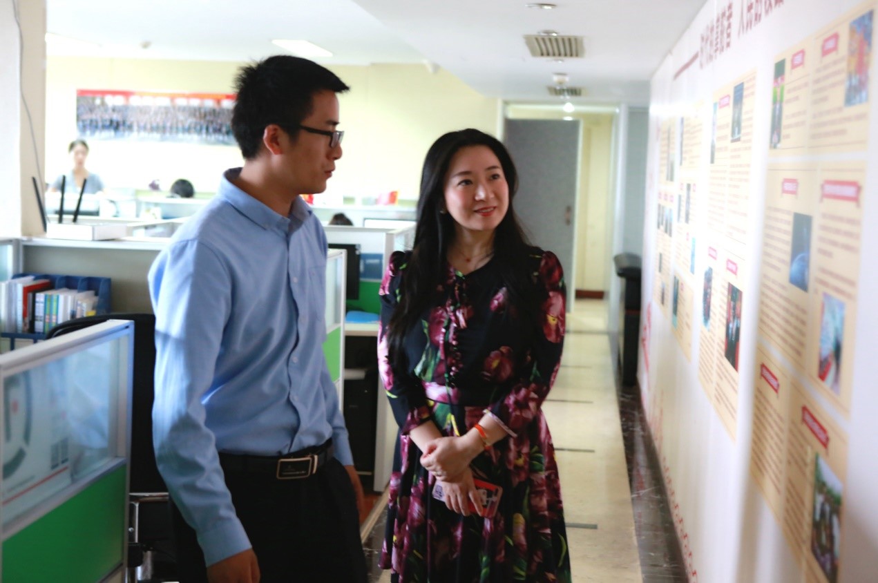 張林總監(jiān)正在向傅瀟霄院長介紹公司文化墻