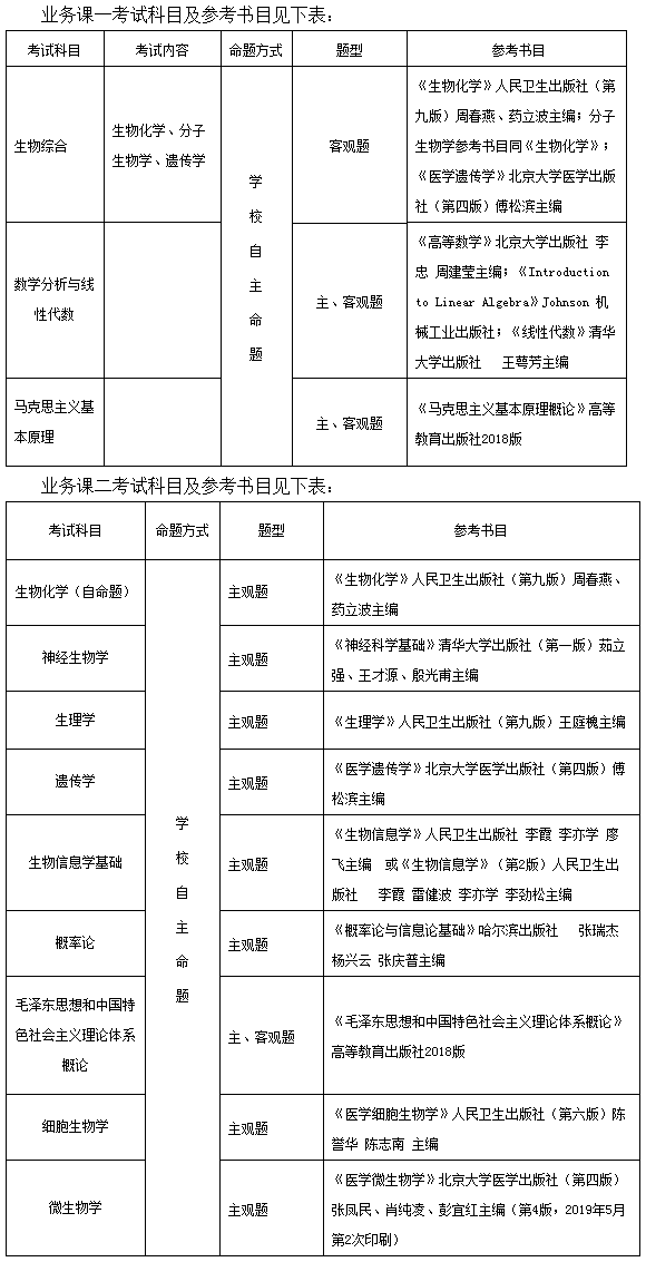 ③理學門類中生物學一級學科所涵蓋的所有二級學科(生理學、微生物學、神經生物學、遺傳學、發(fā)育生物學、細胞生物學、生物化學與分子生物學、生物物理學)、生物醫(yī)學工程一級學科、工程碩士(生物醫(yī)學工程)和法學門類的思想政治教育專業(yè),初試科目仍為四門,第三門為業(yè)務課一考試科目(150分),第四門為業(yè)務課二考試科目(150分)。