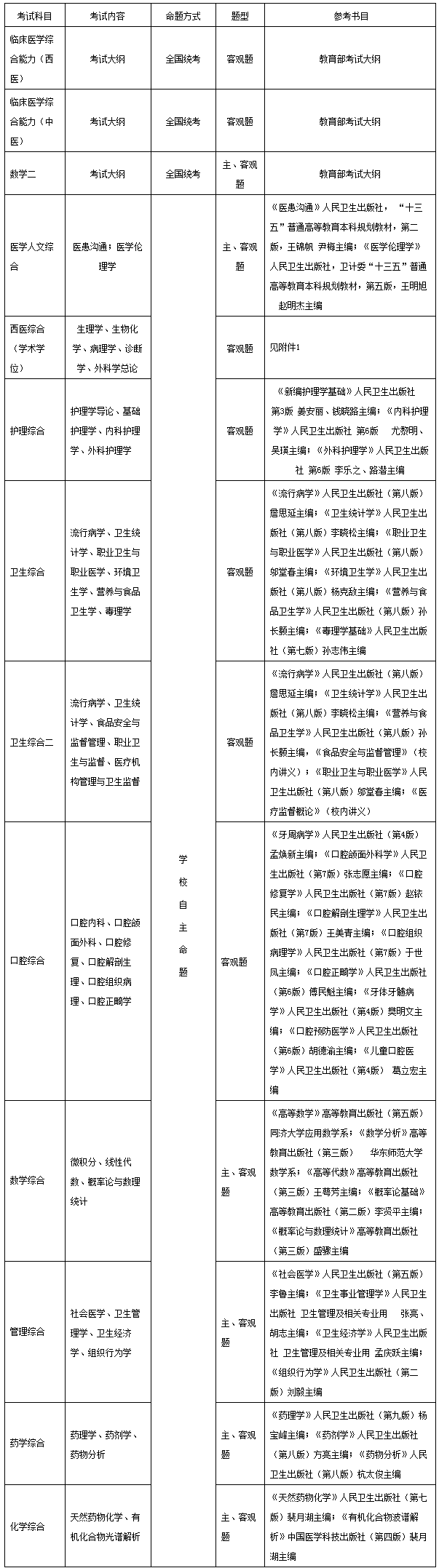 醫(yī)學門類專業(yè)基礎綜合考試科目及參考書目等見下表: