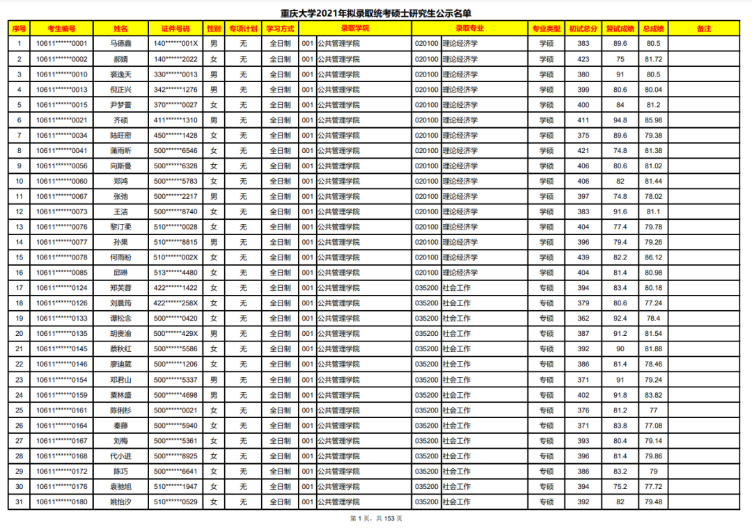以下為重慶大學(xué)2021年考研部分錄取名單: