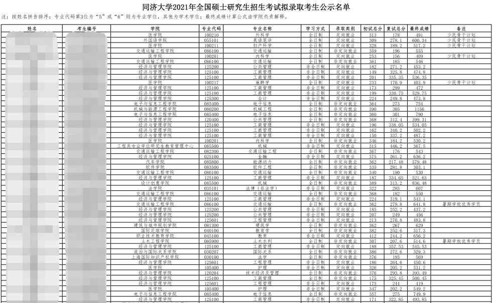 以下為同濟(jì)大學(xué)2021年考研部分錄取名單: