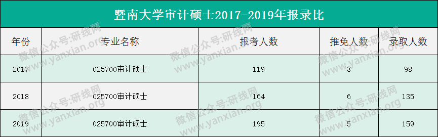 2020年的復(fù)試分?jǐn)?shù)線和報錄比未確定,研線網(wǎng)整理了暨南大學(xué)審計碩士2017-2019年的報錄比,供大家參考。