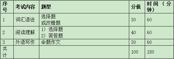 本考試包括以下部分:詞匯語法、閱讀理解、外語寫作等??偡譃?00分。