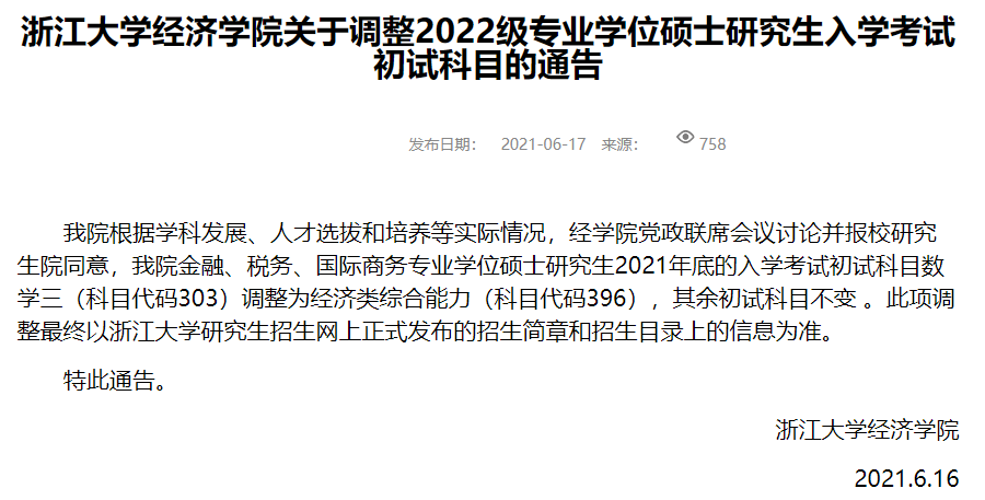 2022考研科目調(diào)整:浙江大學(xué)經(jīng)濟(jì)學(xué)院2022年碩士研究生招生考試初試科目調(diào)整通告