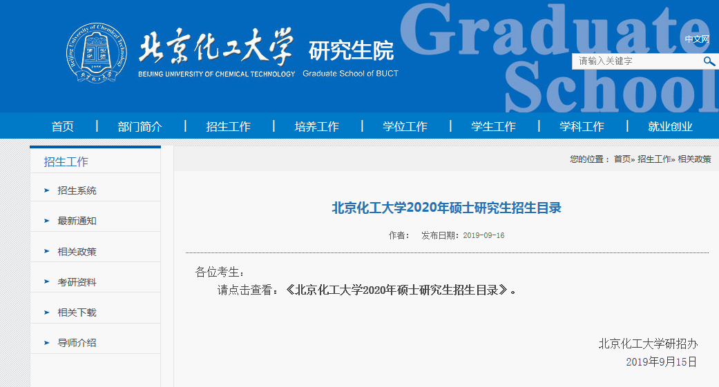 2020年碩士研究生招生專業(yè)目錄陸續(xù)已出,今天小編給大家整理的是“北京化工大學(xué)2020年碩士研究生招生目錄”的相關(guān)內(nèi)容,有報(bào)考意愿的小伙伴要注意下哦!
