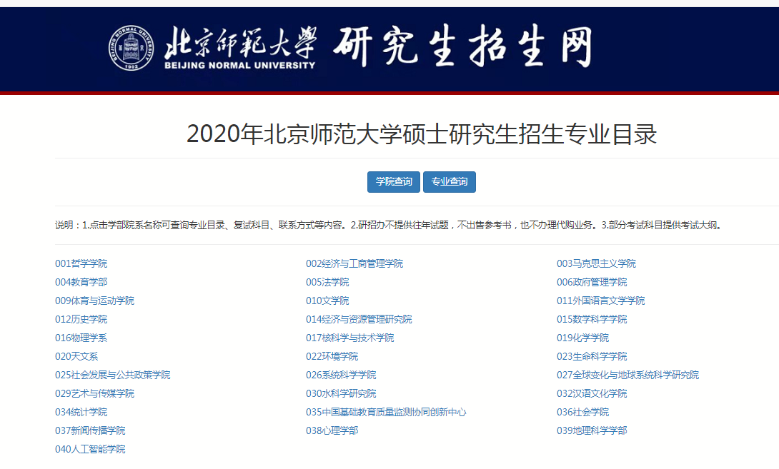 2020年碩士研究生招生專業(yè)目錄陸續(xù)已出,今天小編給大家整理的是“2020年北京師范大學(xué)碩士研究生招生專業(yè)目錄”的相關(guān)內(nèi)容,有報考意愿的小伙伴要注意下哦!