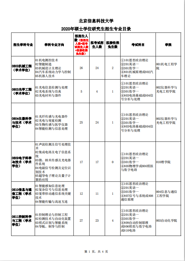 北京信息科技大學(xué)2020年碩士學(xué)位研究生招生專業(yè)目錄